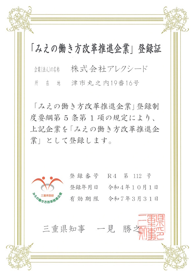 当社は、2022年10月1日に「令和4年度 みえの働き方改革推進企業」として登録され、「三重県のホームページ」に掲載されました。これからも、社員のみなさんが働きやすい制度や環境を構築します。