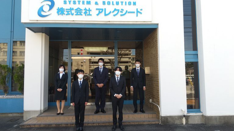 備品を受け取る為に出社した新入社員のみで、屋外でマスクを着用し、距離を保って記念撮影をしました。 今年も入社式はリモートで開催します。